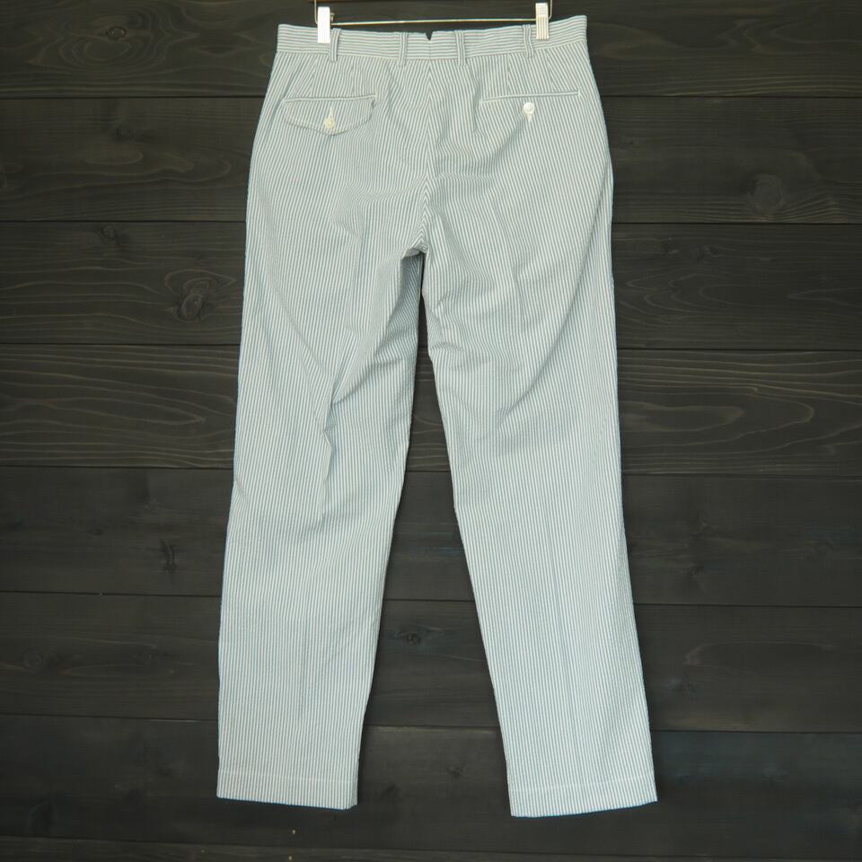 波状の縞模様による凹凸感が特徴で肌に触れる面が少ないため、ドライなタッチで涼しげなシアサッカー生地を使用した春夏にぴったりの一本。白シャツや白Tに足元はローファーなどとあわあせるのもおすすめ。RL刻印入りYKKジップフライ、コインポケットつき。