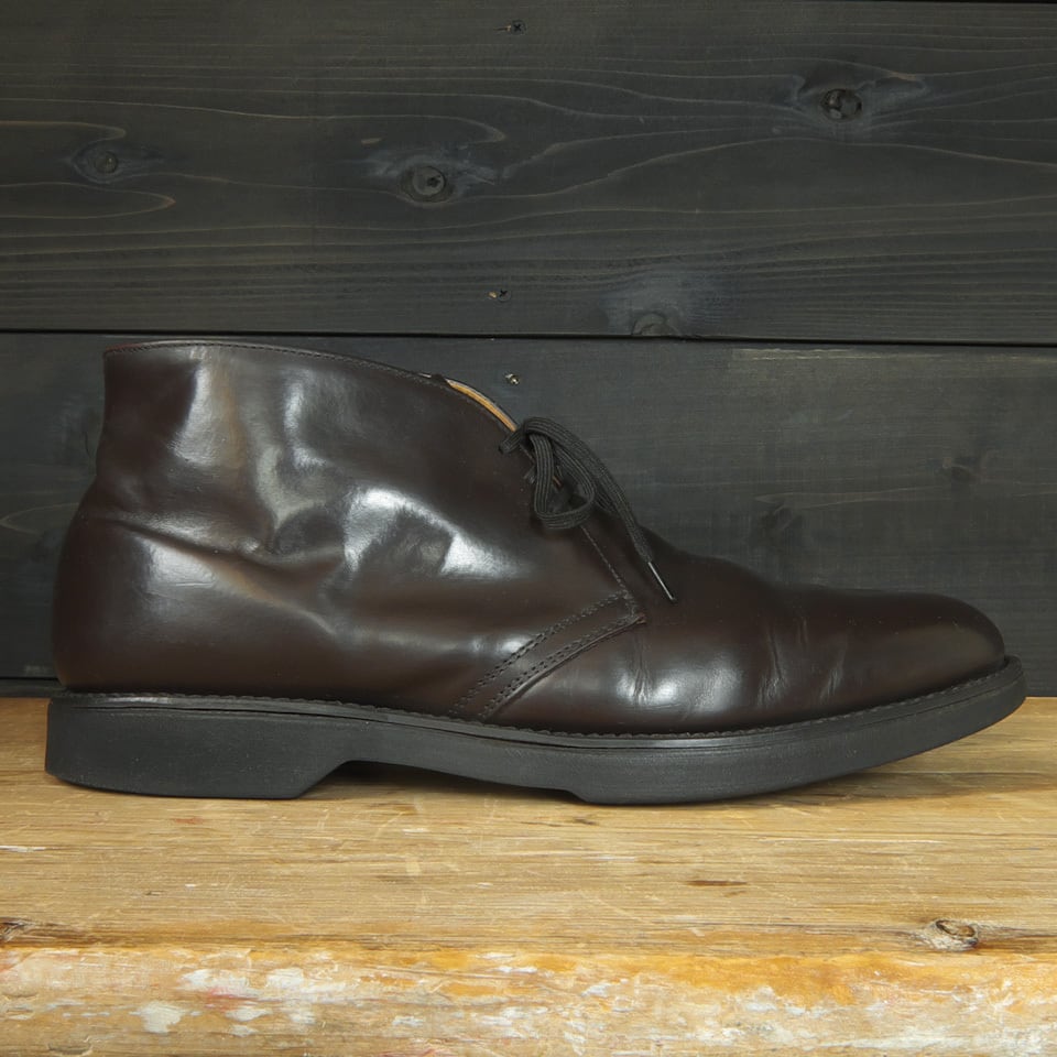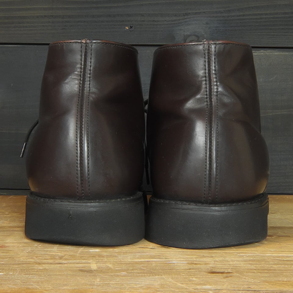 アメリカの郵便局員のために作られた本物のポストマンシューズ。USPS(United States Postal Service)の刻印は見つからないものの同型モデル。ポストマンシューズはその履きやすさとデザインからも人気が高く、他ブランドでもレプリカとして製造されることも多い完成度の高いデザイン。中でもチャッカブーツタイプは人気が高く、市場に出回る数も少ない。黒に近いダークブラウンの色合いと光沢のあるコードバンのようなレザーの風合いも素晴らしく大切にお使いいただきたい一足。UFCW (The United Food and Commercial Workers International Union)のユニオンスタンプ入り。