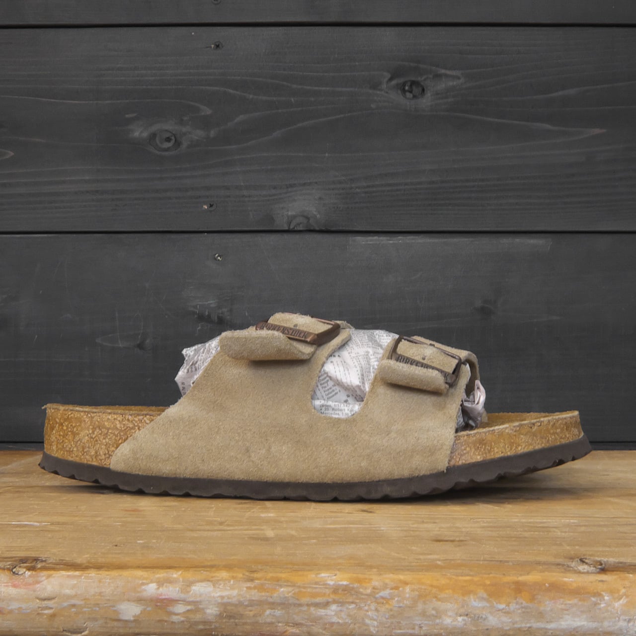 世代や性別を問わず愛されている『BIRKENSTOCK』の定番モデル「ARIZONA」。2本のベルトで自由にフィット感を調整でき、アッパー部分には、肌触りが良く高品質なナチュラルスエードを使用。フットベッドには、足の形状を考慮した特製のフットベッドが使用されており、一日中快適にお使いいただけます。定価15,400円の品。
