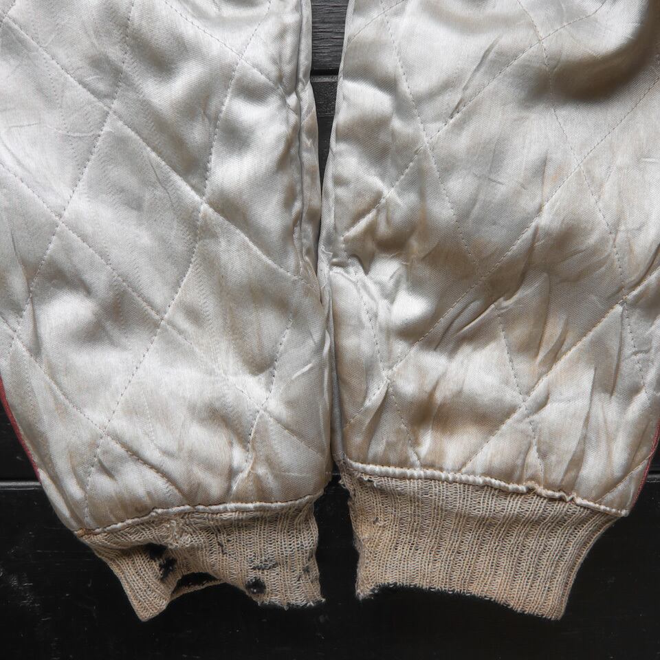 ダメージ多数ありの雰囲気モノ。とはいえ、バックの顔トラも迫力があり袖のラインや、裾リブの絶妙なリメイクなど素晴らしい一枚。ボディカラーもブラックで迫力がありながらも飽きづらく、お好きな方にはたまらないスカジャンの魅力がたっぷりでています。バックカラーの褪せた朱色も素敵で気分を変えたい時にぴったりです。中綿入りですが、ほどよい厚さなので防寒性もありながらスマートなシルエットを保っているのも魅力。