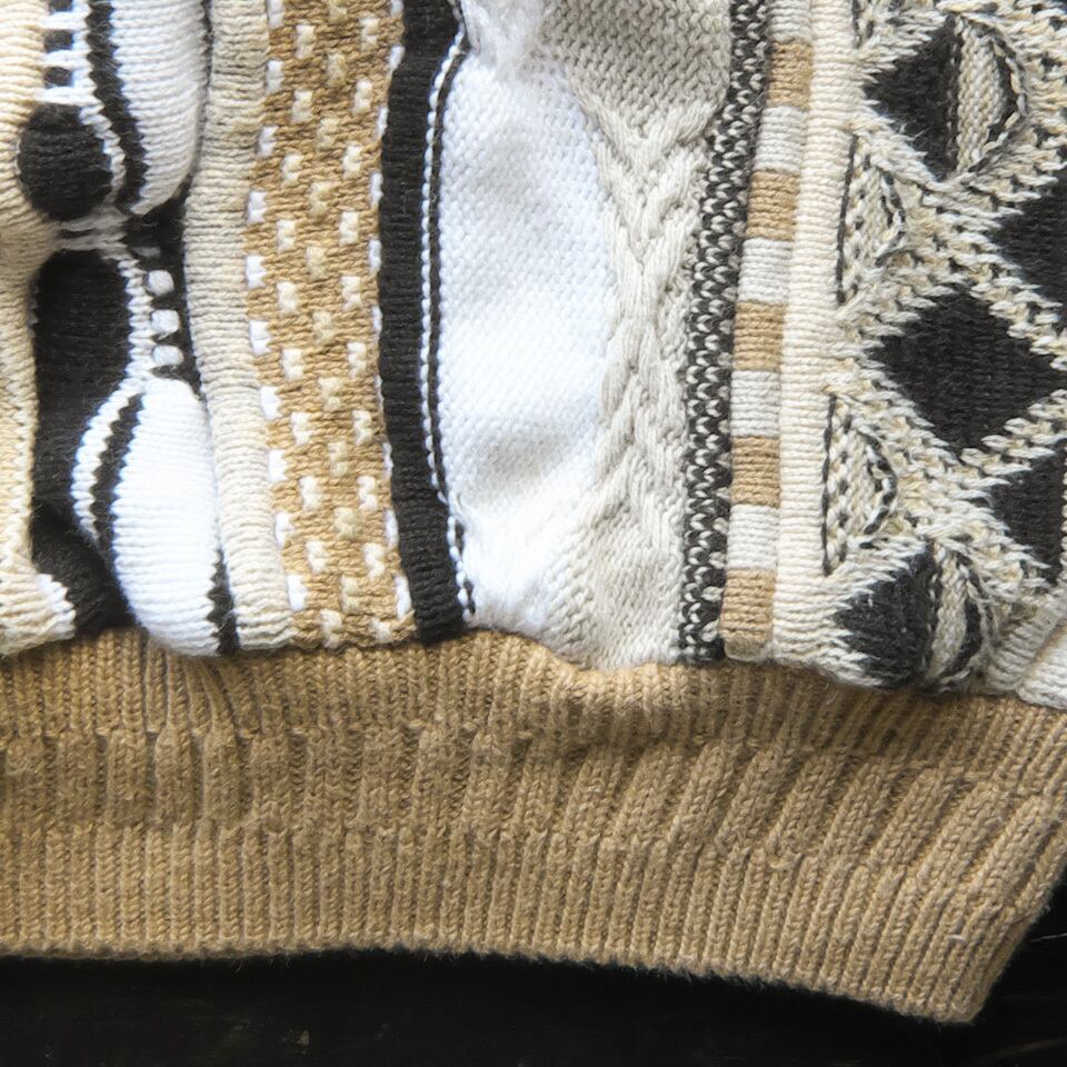 凹凸のある素材感と総柄の大胆な配色が魅力のセーター。大きめサイズですが、ワンサイズアップくらいでゆったりと着るのもおすすめ。