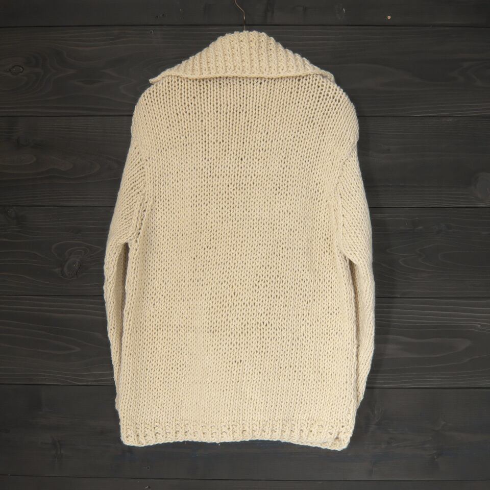 ハンドニットならではの暖かみのある風合いで、女性らしいデザインが魅力のセーター。素材もアズロン(天然タンパクを再生して繊維にした人工繊維)という聞きなれない繊維が50%入っているが毛足の長い繊維が混じり風合いも良く、肌触りも良い素敵な編み地です。プルオーバーなのでゆったりと着るのがおすすめ。